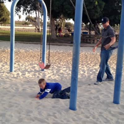 Two young boys take turns pushing their dad in a swing outdoors when the younger tot boy gets too close to the swing and gets knocked in the face before he falls on the ground.