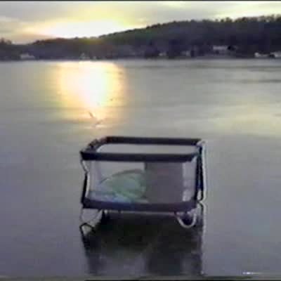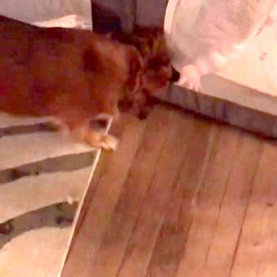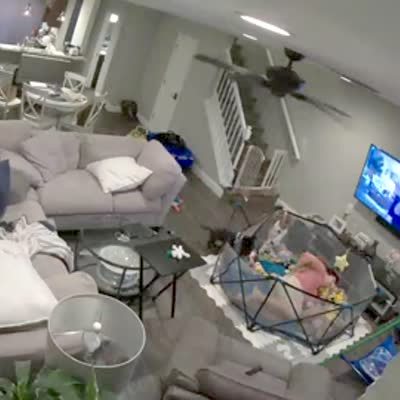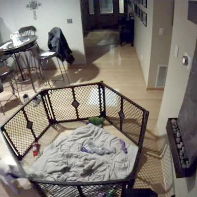 A baby girl coos in her playpen, and a dog uses its teeth to unzip the opening and walks in in the living room.