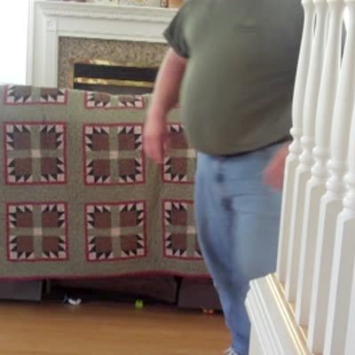 A man chases after a dog into its playpen in the kitchen. The man falls over and breaks the playpen and the dog runs out of the other side.