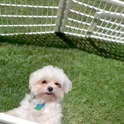 A man and woman call for a Maltese dog to leave his open playpen in a yard but the dog is confused and doesn't understand he can walk through a large opening behind him.