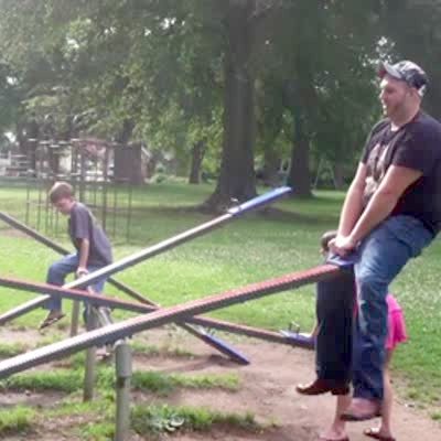 Man and brother ride teeter-totter at playground, one on left falls hard and hits head. . Senior