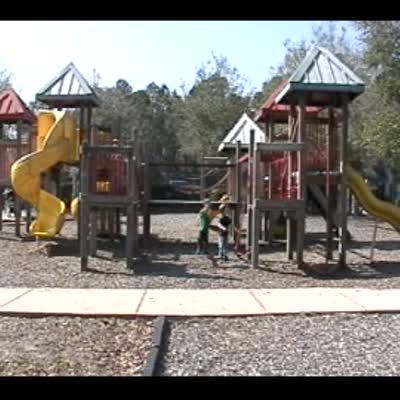 Man plays with 2 tot boys at the park and runs up the slide to chase them. Man hits his head & falls back down the slide. 1 kid says "get up." Playground.