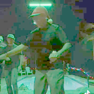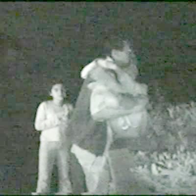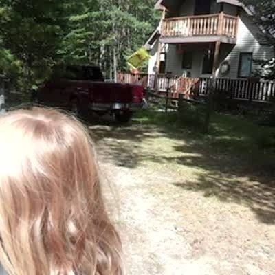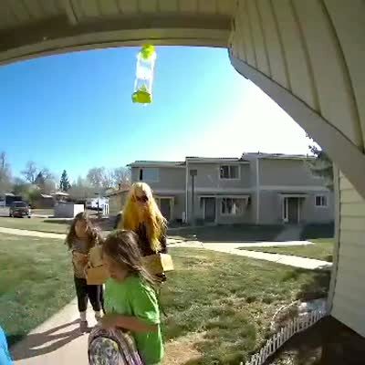 A teen girl walking out of the door notices a spider on her hand and gets scared. She screams then flies into the potter plant and says, "Oh, I'm bleeding bad" on the front porch. Security footage.