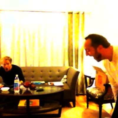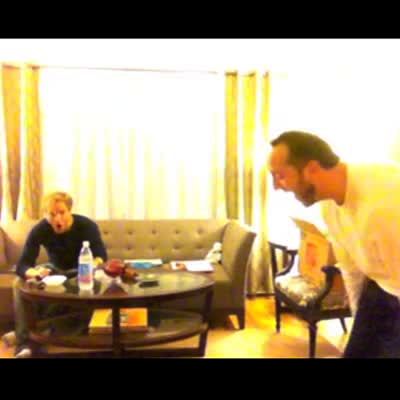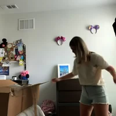 In a living room, teen girl dances and tries to jump into man's arms. She falls hard on the ground, making a loud banging noises. Another man sits on couch & laughs.