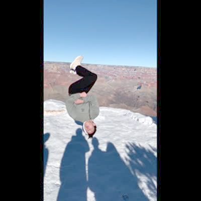 A teen boy does a back flip in slow motion at the Grand Canyon and slips on winter snow when he lands and falls forward and almost falls off the cliff.