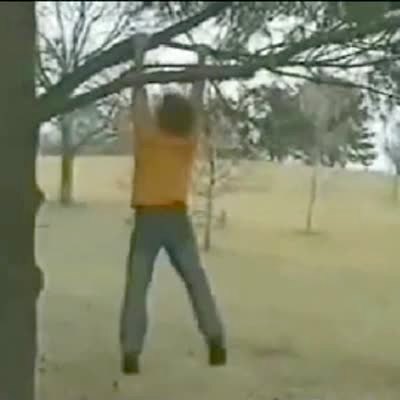 Teen boy breaks zip line and falls on butt while riding down from tree house.