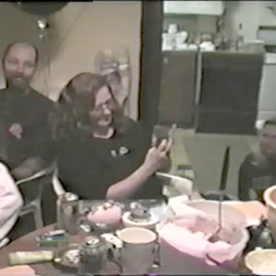 Adults offscreen sing "Happy Birthday" to a young boy who sits in a chair with a cake in front of him. He blows out the candle and falls out of his chair.