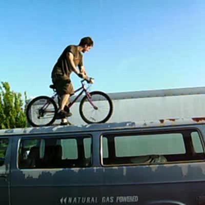 Young man rides a bike off the top of a van & falls into a bush when trying to jump over it. Man laughs & is ok. Stunt. Bonehead.