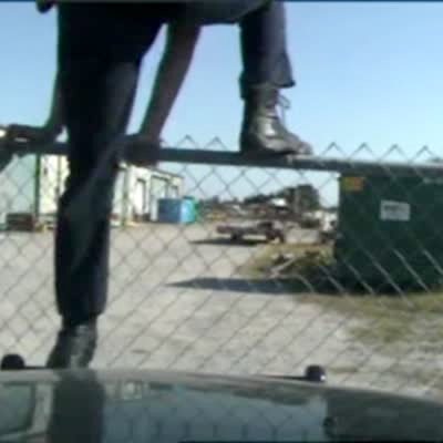 A police officer falls trying to get over a fence in front of his cop car camera.
