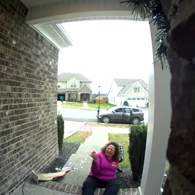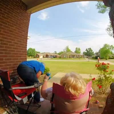 A man yells at people to get out of the road then the woman falls through her chair on the front porch. Security footage.