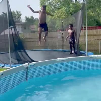 A young boy jumps on a trampoline and flips into a pool but hits the edge in the backyard.