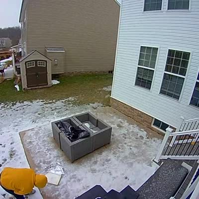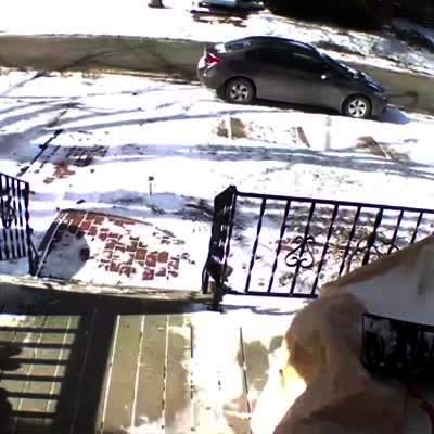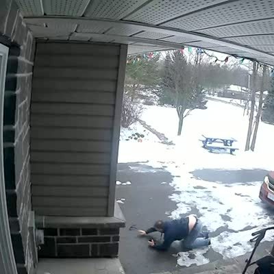 A man opens the front door and slips to the pathway and falls into the snow in the front yard. Security footage.