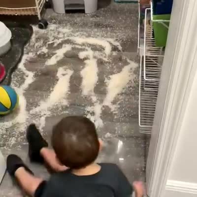 A young boy stands and falls on rice on the floor as a woman talks to him in the pantry.