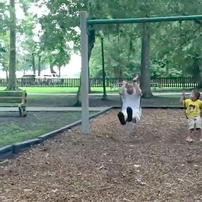 Tot boy laughs at dad climbing on monkey bars at playground, falls off platform he's laughing so hard.