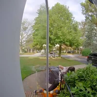 A man knocks over a post/column as he trips and falls on a front porch and a woman laughs. Home security camera video.