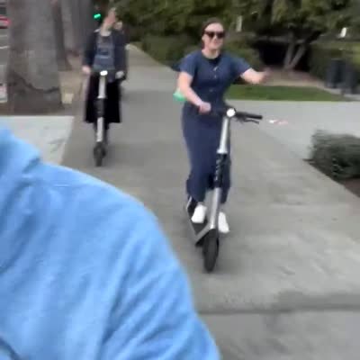 A woman rides a scooter and falls on the sidewalk outdoors.
