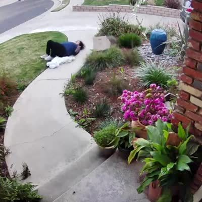 A woman walks out of the house then her backpack catches on the door and she falls in the front yard. Security footage.