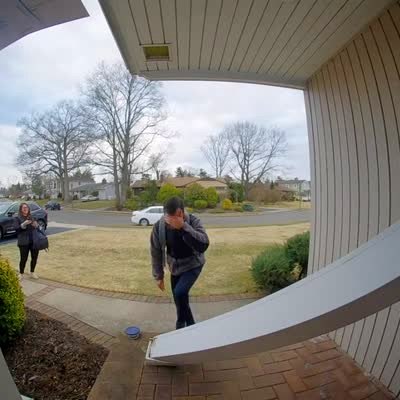 A man open the door then the wind closes it and hits a woman in the front yard. Security footage.