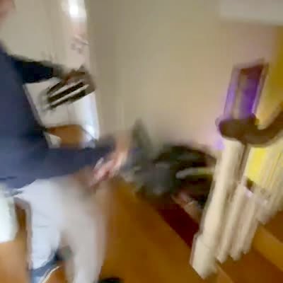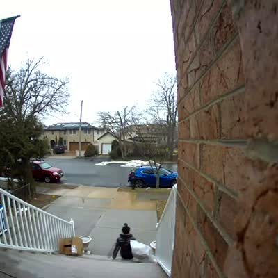 A woman carries a bag and a box, then falls down an entire flight of stairs in front of the house. Security footage.