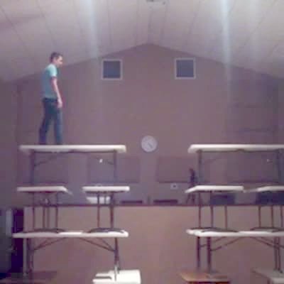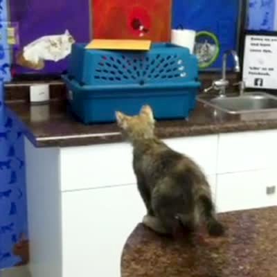 "Flying Feline" A cat tries to jump from one counter to another and comes up short. Falls