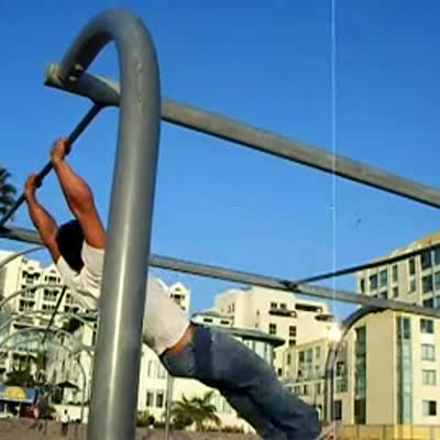 A man swings from gymnastics bar to gymnastics bar on a beach. When he tries to reach the third bar, he misses and falls face first on the sand. Short tails.