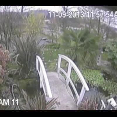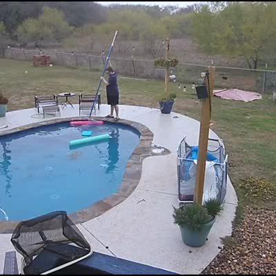 A man is cleaning a swimming pool when his broom is caught in a string of lights, pulling a planter down on him, causing him to plunge into the water. Security footage.