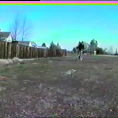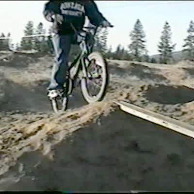BIKE. Man rides bike off backyard ramp, plunges down hill into trees.