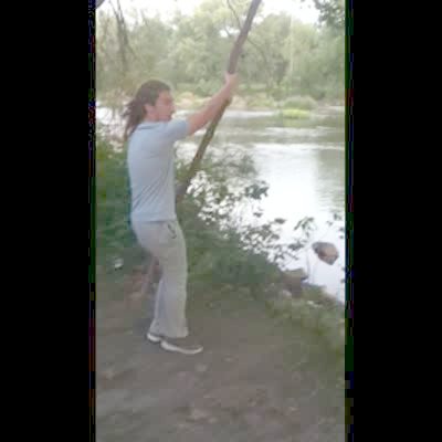 A man with dreadlocks swings on a vine over a lake after saying, "The worse that could happen is I get my feet wet." The vine breaks and he falls in.