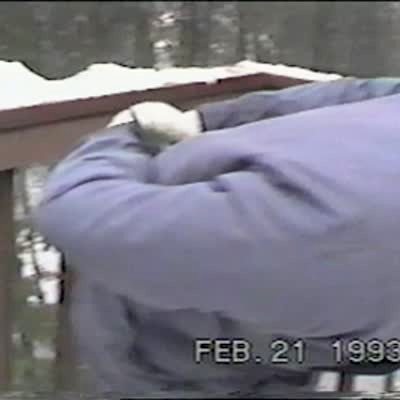 "Dog Pen Plunge" - A woman climbs into a dog's play pen cage in the living room and trips and falls pulling the cage down. The dog runs away in fear of the loud crash.