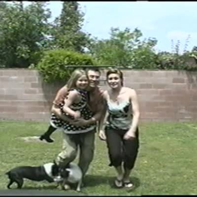 Man shoots family video with wife & daughter. He picks up daughter & wants them all to run towards the video camera while it's on tripod in backyard. They trip over 2 dogs playing in the grass & fall down.