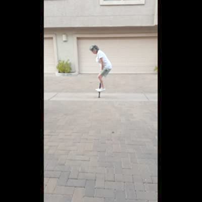 Teen boy hits himself in the crotch while jumping very high on a pogo stick, doing trick moves where he crosses his legs.