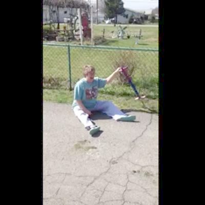 Teen boy does backflips on a pogo stick. He flies off and hits the ground hard. Same submitter as clip 645064/W128456 and 649471 / W128451.