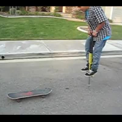 Boy jumping on a pogo stick jumps on a skateboard and falls.