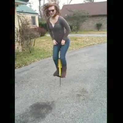 A woman tries to jump on a pogo stick and falls on her butt at 0:25.