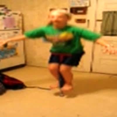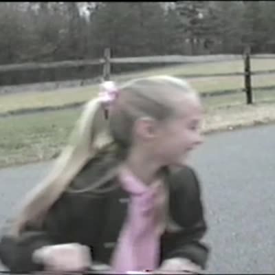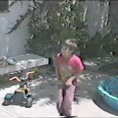 Little girl jumps on a pogo stick, falls into a garbage can and says "I just peed my pants."