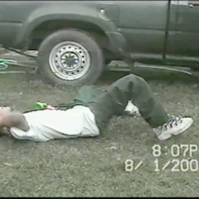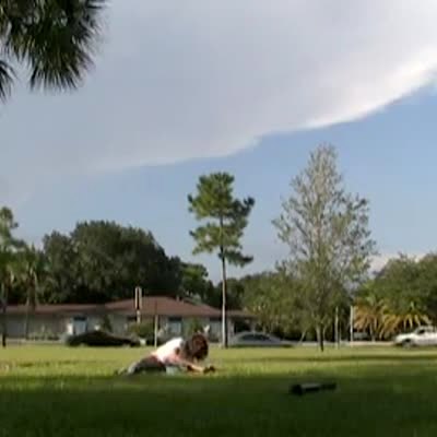 A woman slips and falls over backwards while trying to ride a pogo stick outdoors. A man says, "We just won America's Funniest Home Videos."