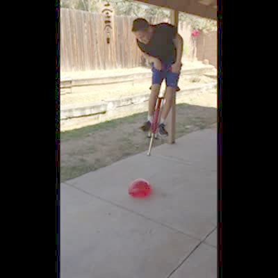 A young boy jumps on a water balloon using a pogo stick in slow motion.