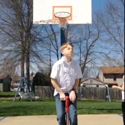 A boy on a pogo stick shoots a backwards shot and makes the basket, outdoors.