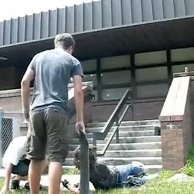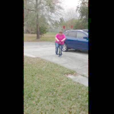 A man jumps on an old pogo stick on the driveway and it breaks and shoots a piece up into his groin.