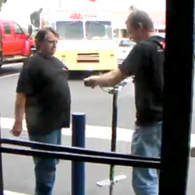 A man uses a Pogo stick to try and break up an icy front porch when he gets mad and throws it but it bounces up and hits him and he slips and falls. Security footage.