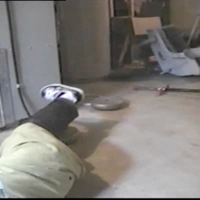 After a woman does 100 jumps on a pogo stick indoors, a man jumps on it and punches a hole in the hardwood floor at 1:10.