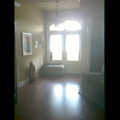 Little dog jumps up and down on sofa to look out window, looks like it's on pogo stick. Shot from across room.