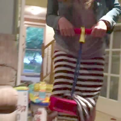 A woman falls off of a Pogo stick in the living room immediately after she begins to jump on it. Glass breaks. Christmas gift.