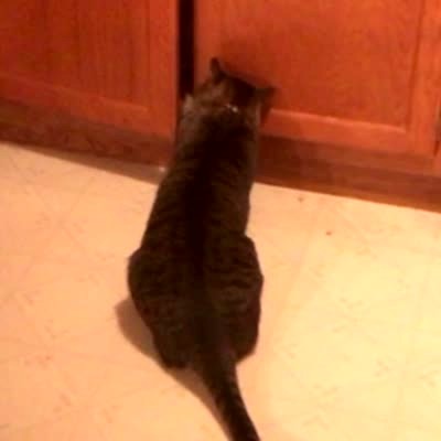 A cat opens a cabinet and, when caught, pretends to be cleaning himself.