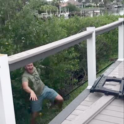 A man leans over the edge of the porch rail to poke at something with a stick and loses balance and flips over the rail and falls on the ground. The clip plays again in slow motion.