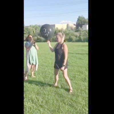 A woman tries to pop a balloon for a gender reveal, but she hits the balloon, it doesn't pop and flies away.