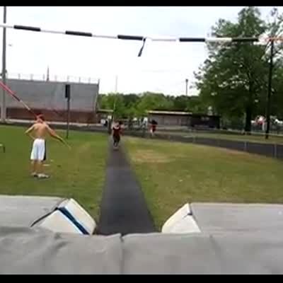 Teen boy tries to pole vault on a school athletic field, but comes crashing down on his coach.