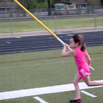 A girl runs with a pole and attempts to pole vault with it but just before she jumps a train horn sounds and causes her to jump and come to a stop.