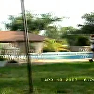 Teen boy tries to pole vault over a clothesline in the backyard, he crashes into the table. SHORT clip.