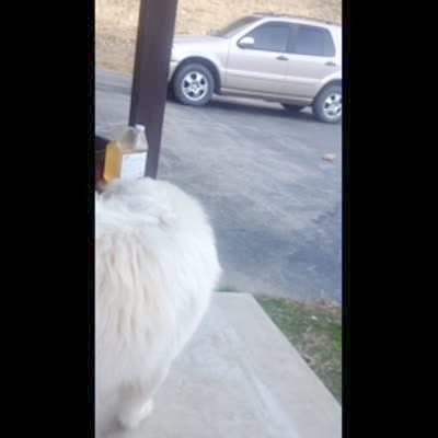 A woman explains that her dog likes to stick her nose in everything and then asks if it wants her nail polish remover. She holds a cotton ball with nail polish remover on it in front of the dog in the driveway and the dog makes an upset face and pushes the cotton ball away with its paw.